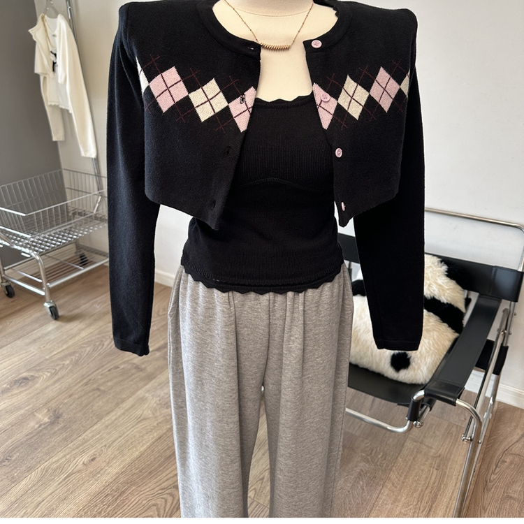 撞色經典 背心 無袖 針織開衫 兩件套毛衣套裝 菱格紋長袖 學院風由