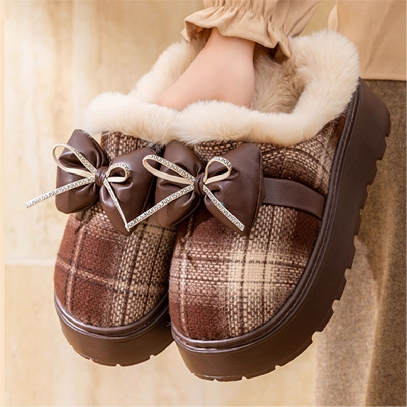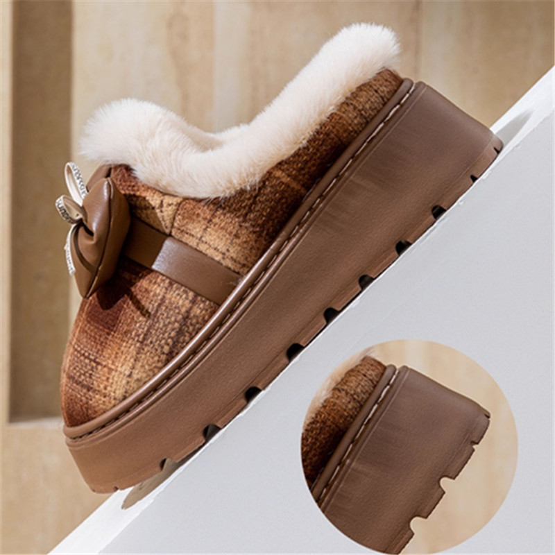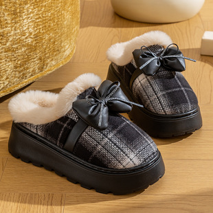 厚底月子鞋 保暖外穿 冬季 高跟厚底女坡跟復古格子蝴蝶結包跟棉拖鞋由
