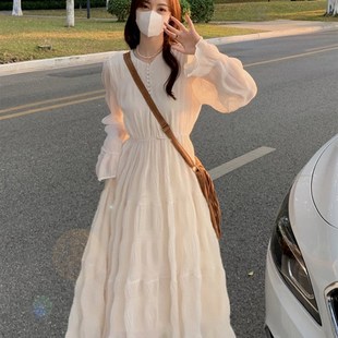 仙女法式 雪紡連衣裙夏 初戀白色公主裙收腰顯瘦壓褶度假長裙子長袖由