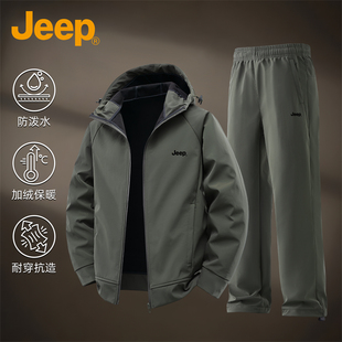 JEEP 套裝 男加絨防風(fēng)防水戶外登山寬松大碼 吉普軟殼沖鋒夾克衣褲由