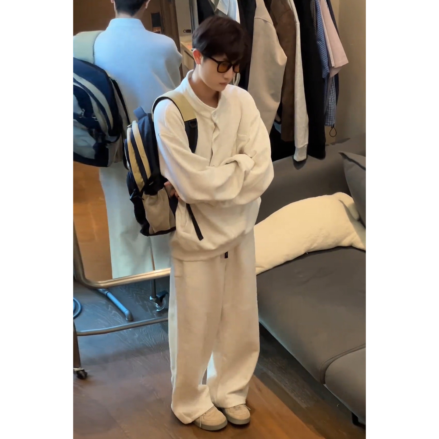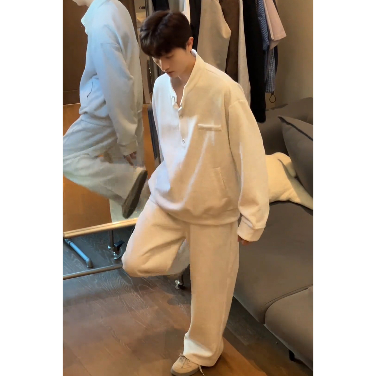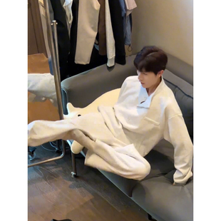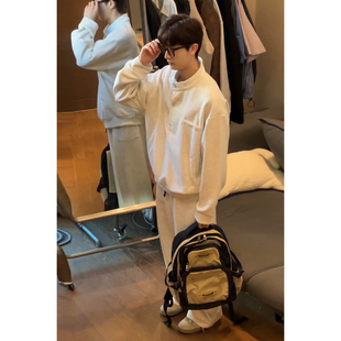 男生早秋穿搭套裝 韓系痞帥 衛衣松弛感闊腿衛褲 白灰色亨利領polo衫由