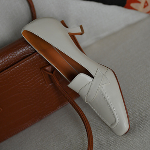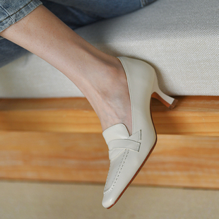 淺口單鞋 皮厚先生 女 新款 真皮2024春季 米白色方頭女鞋 細跟高跟鞋由