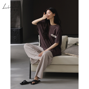 長褲 帶胸墊 莫代爾睡衣女士夏天短袖 可外穿家居服套裝 條紋時尚由