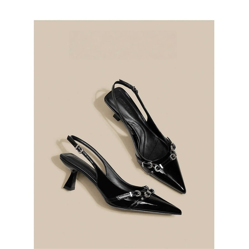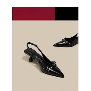 子2025氣質(zhì)金屬R一字式 扣帶包頭涼 女細跟尖頭淺口單鞋 黑色高跟鞋由
