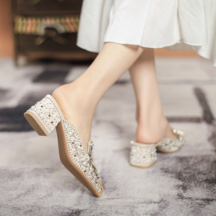 尖頭粗跟珍珠花韓版 水鉆百搭包頭網紗中跟涼拖女 鏤空時尚 2025新款由