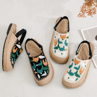 L05精致狐貍刺繡平底夏季 新款 深口包頭亞麻布鞋 涼鞋由