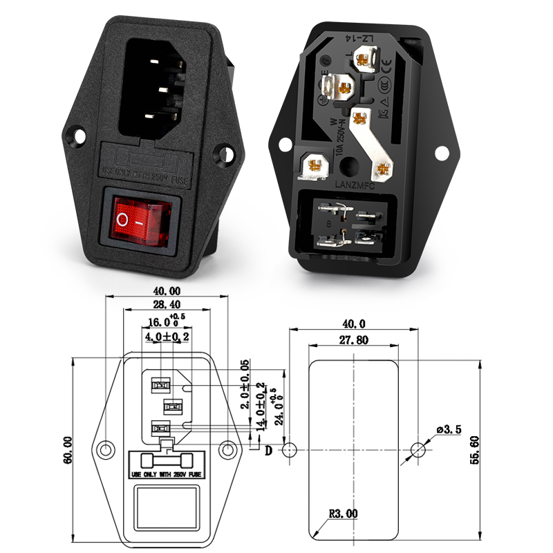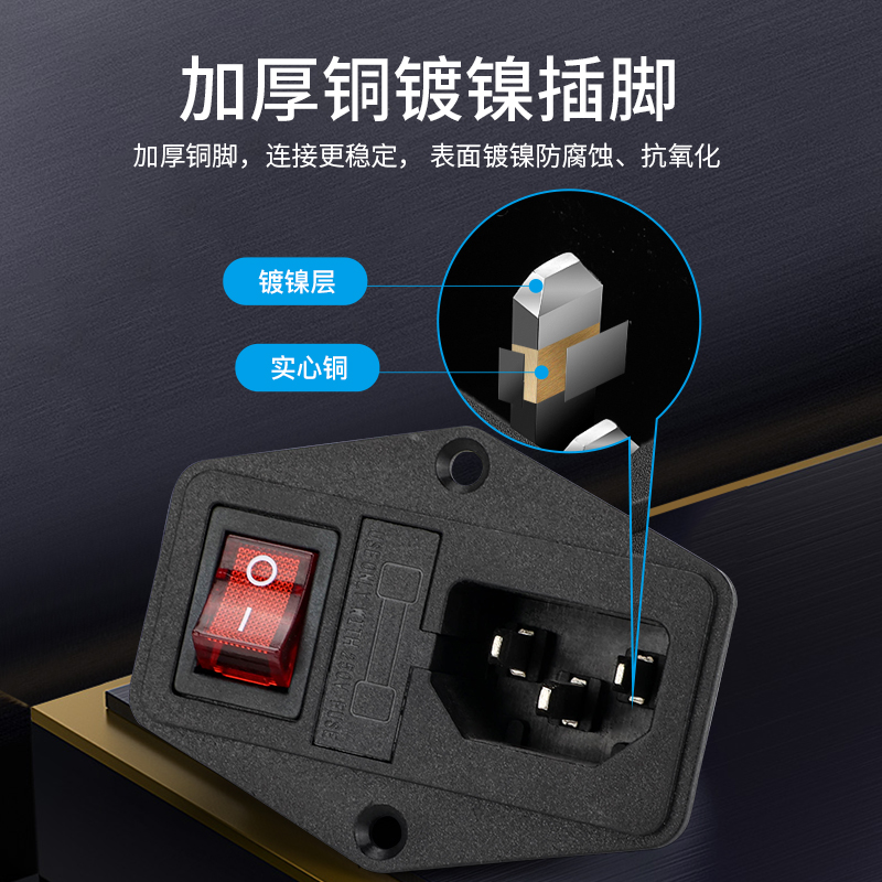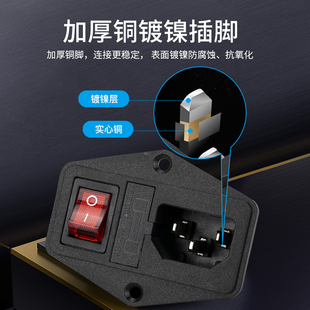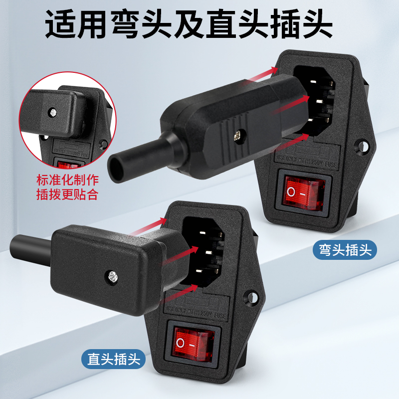 設備AC插座電源插頭帶紅色開關配線10A 橫向品字插座帶燈帶保險絲由