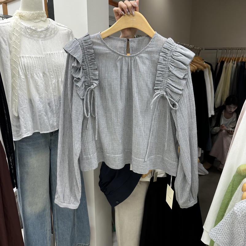 襯衫 上衣50725 圓領豎條紋木耳邊寬松套對長袖 ALIVE由