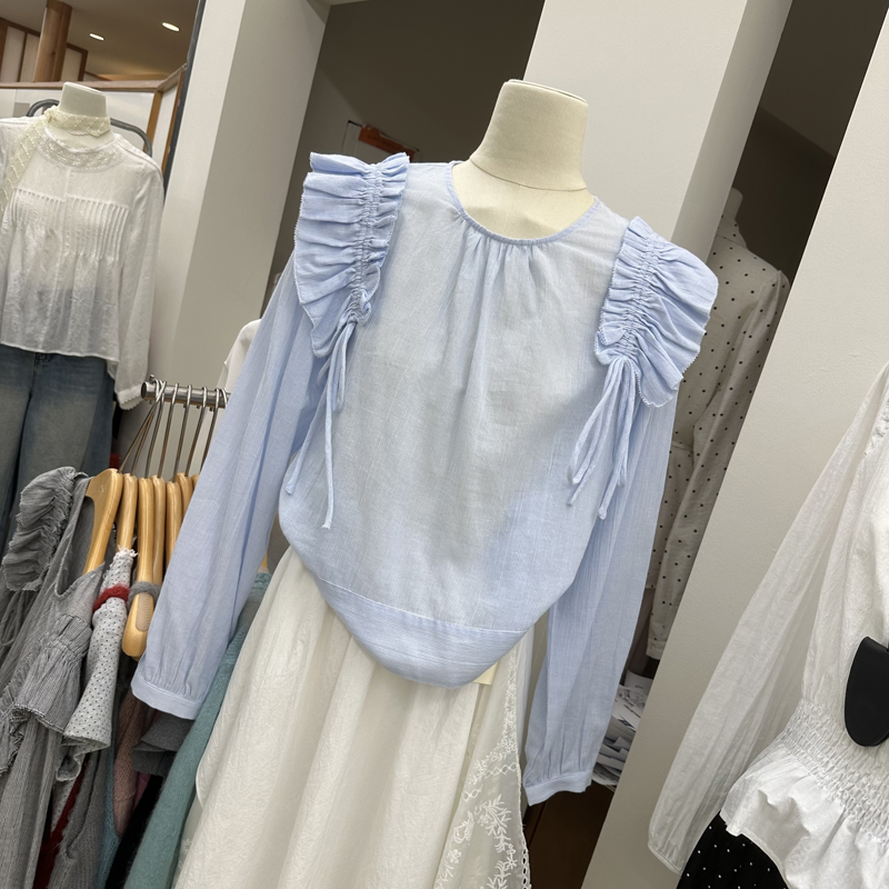德瑪納文藝復古牛仔襯衫 新款 圓領木耳邊裝 飾抽繩襯衣上衣 女25秋季