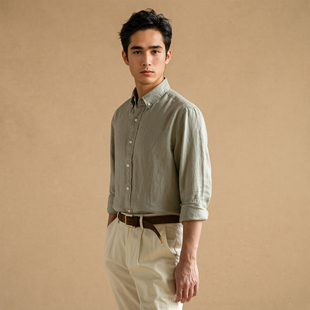 PUPP春夏季 長袖 休閑簡約純亞麻透氣干爽商務領扣襯衣襯衫 男士由