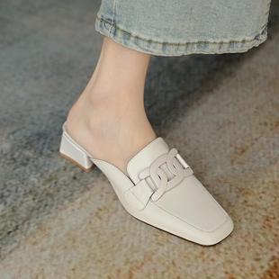 2025年夏季 百搭真皮涼拖方頭穆勒拖鞋 女中跟粗跟包頭半拖鞋 新款由