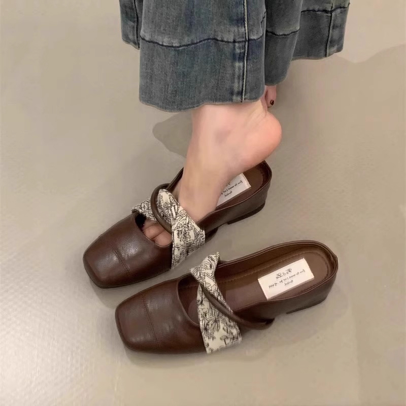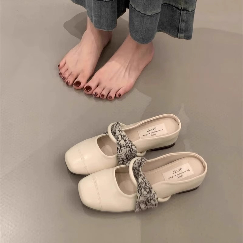 外穿瑪麗珍鞋 金屬方頭平跟包頭半拖鞋 女2025春夏新款 軟底拖鞋 單鞋