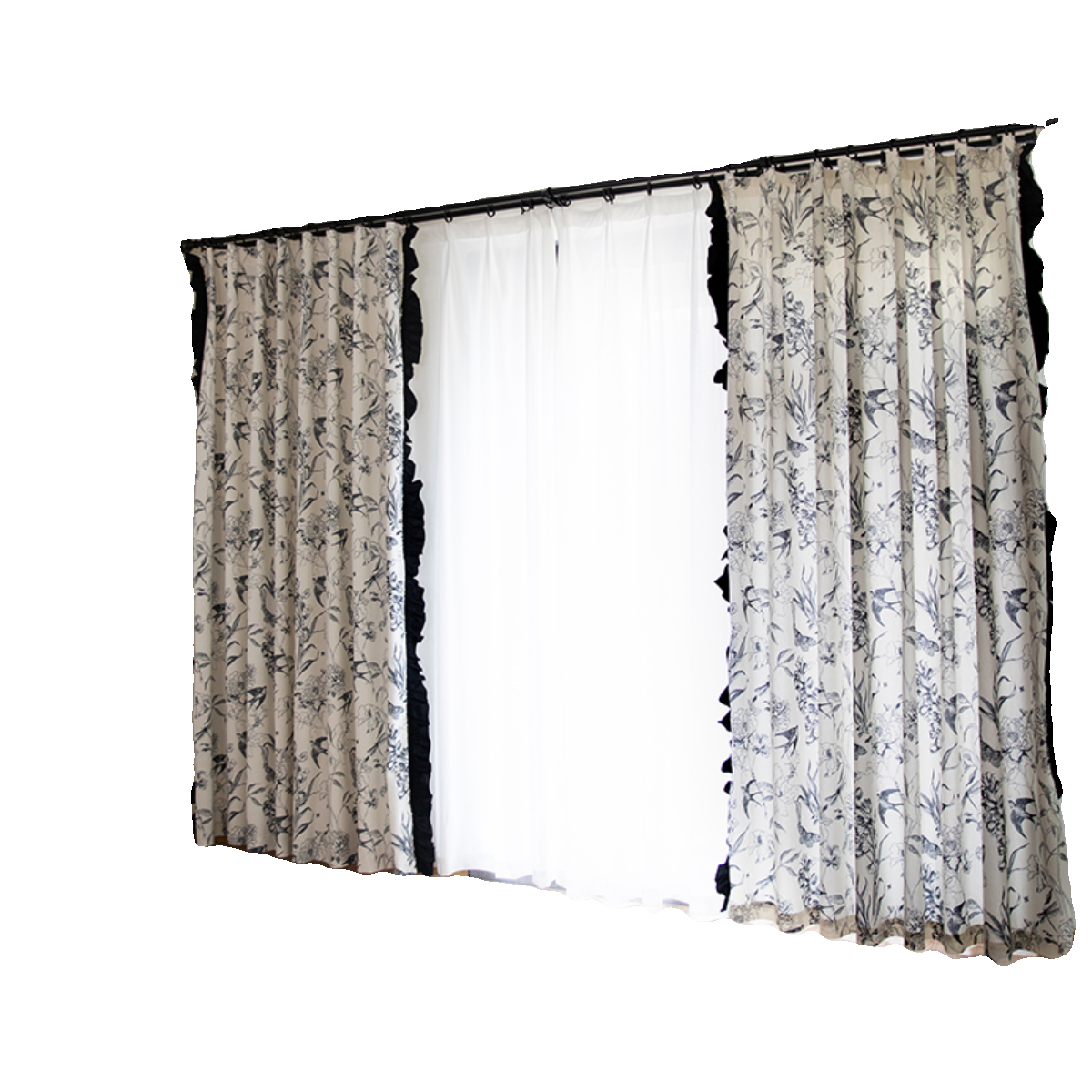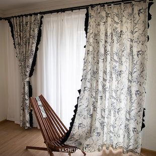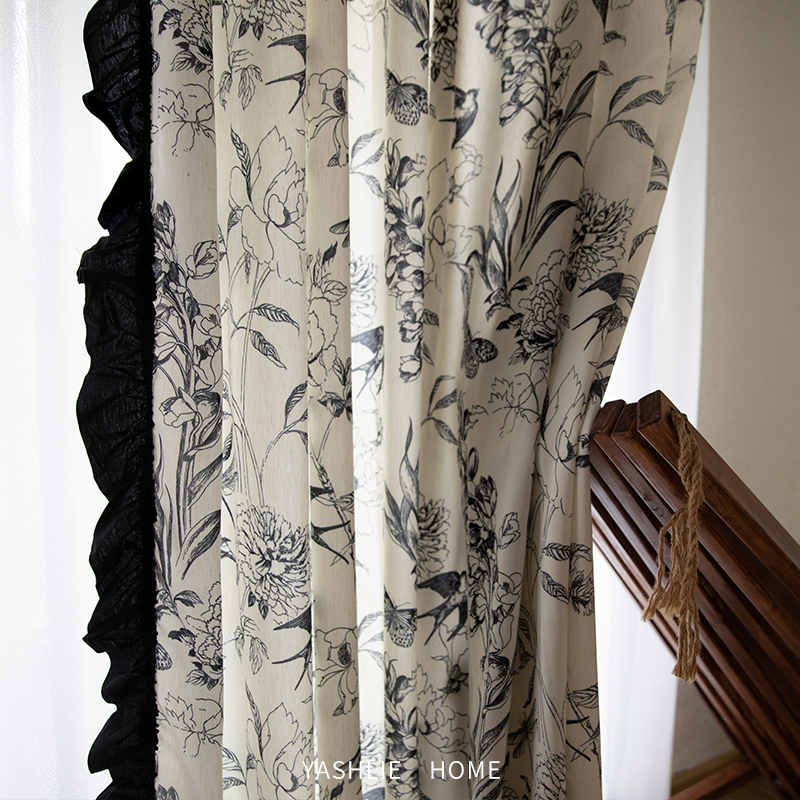 YASHLIE 浪漫荷葉邊窗簾棉麻優雅復古黑白素描風半遮光 燕子法式由