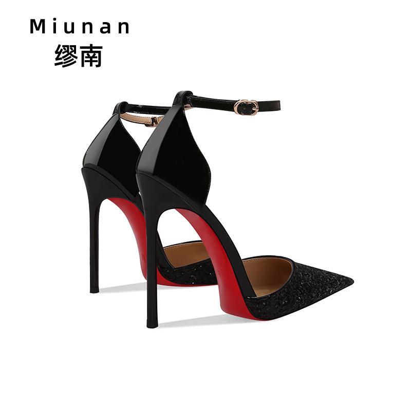 繆南黑色亮片一字扣帶高跟鞋 細跟尖頭中空時尚 氣質單鞋 女2025爆款由