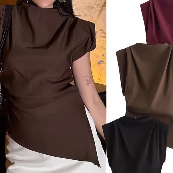color solid top純色褶皺圓領(lǐng)上衣女 round neck pleated Women由