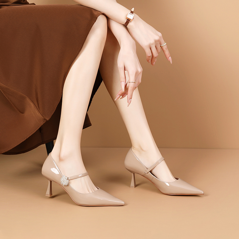 珍珠一字扣帶尖頭高跟鞋 新款 氣質裸色漆皮淺口單鞋 女細跟2025春季由