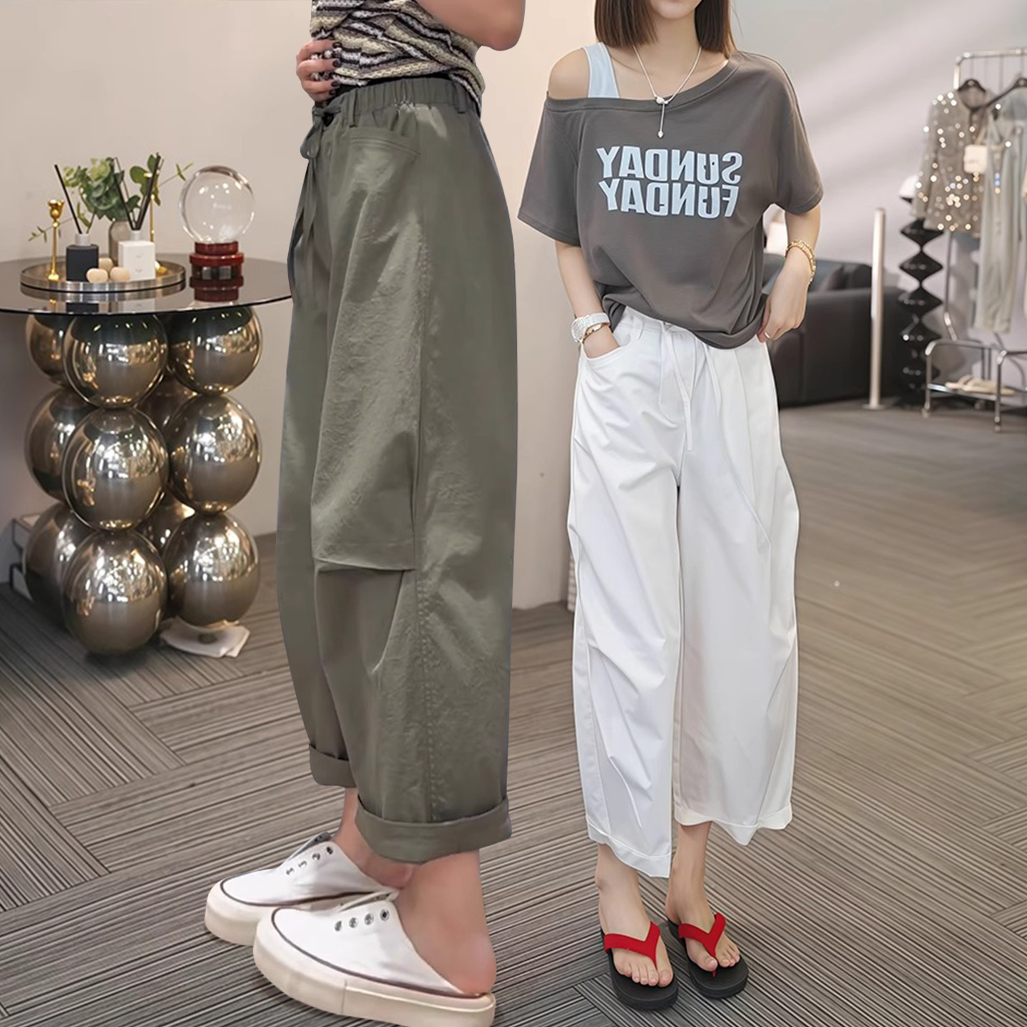 高腰闊腿大碼 八分小個(gè)子純棉工作褲 女軍綠色夏季 薄款 子 顯瘦彎刀褲由