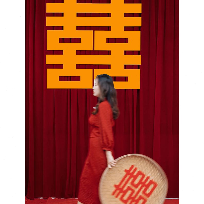現(xiàn)場(chǎng)布置紅布帷幔復(fù)古婚禮酒紅色喜字拍照背景布字婚慶結(jié)婚金色囍由