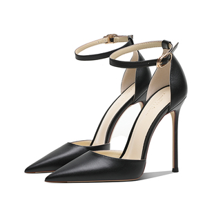 高跟鞋 2025年新款 性感黑色氣質尖頭中空單鞋 女細跟一字扣包頭涼鞋由