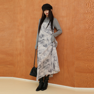 AIRIQI秋季 復古風印花直筒顯瘦國風暈染吊帶連衣裙AY43LQ204 新款由