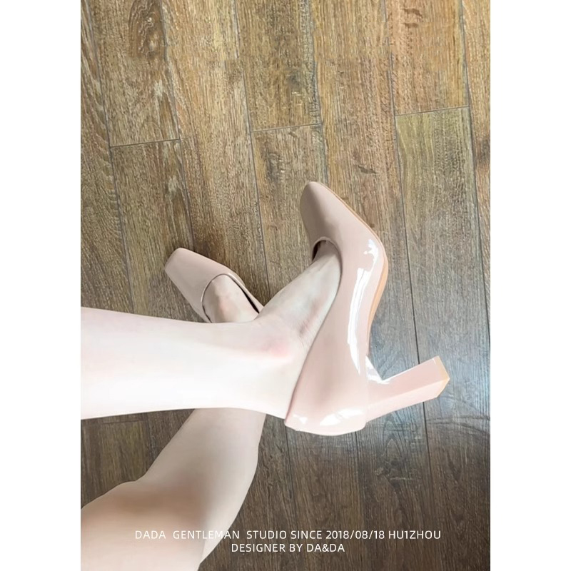 基礎手作 女秋粗跟方頭新款 軟皮不磨腳通勤面試單鞋 裸粉色高跟鞋由