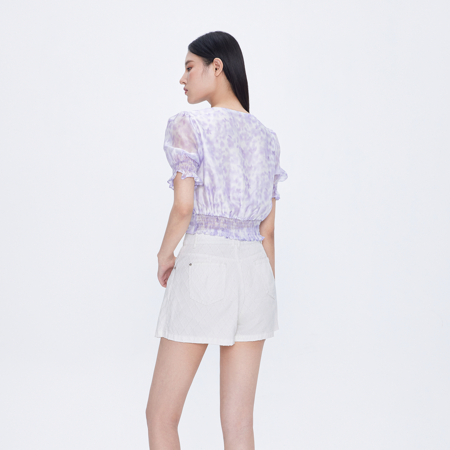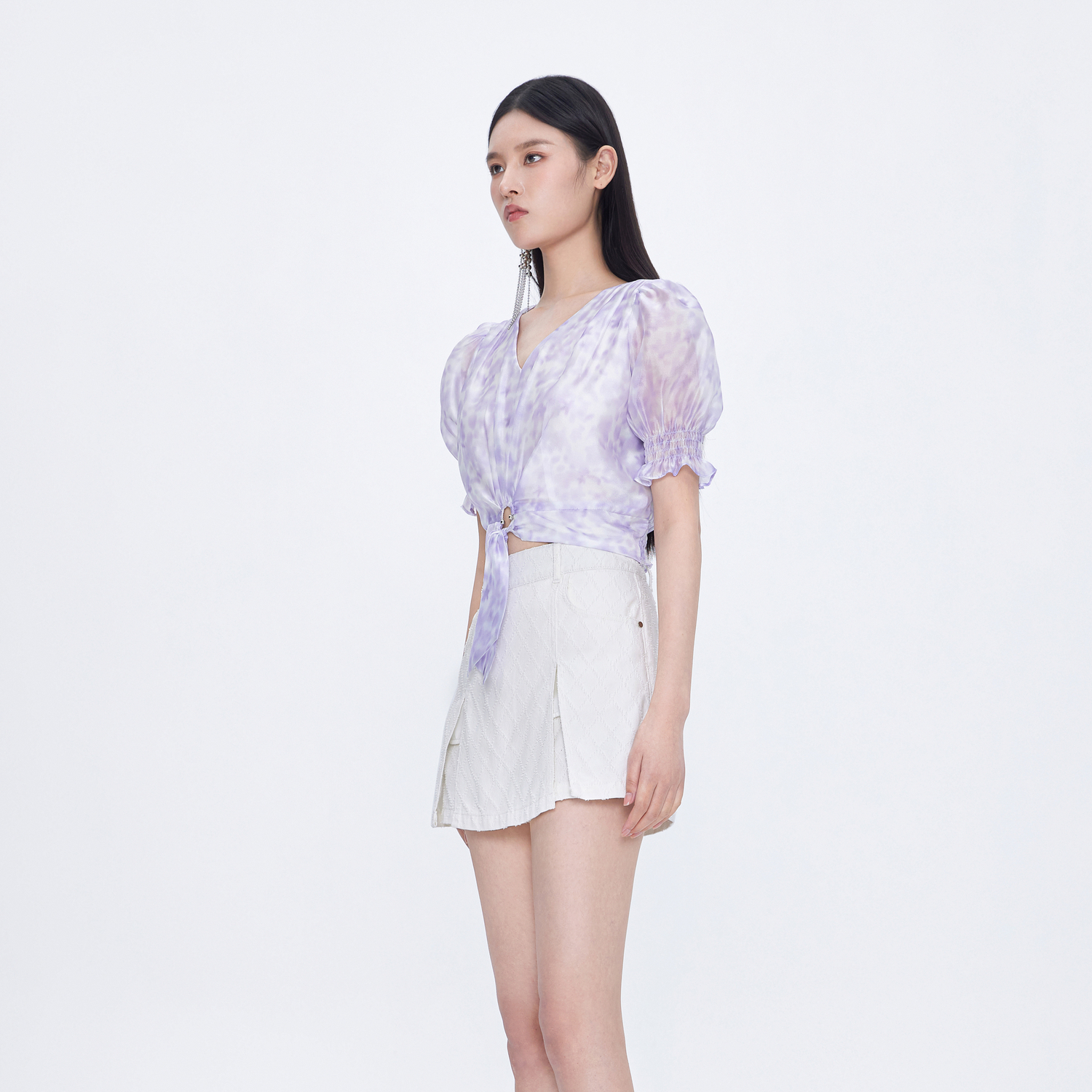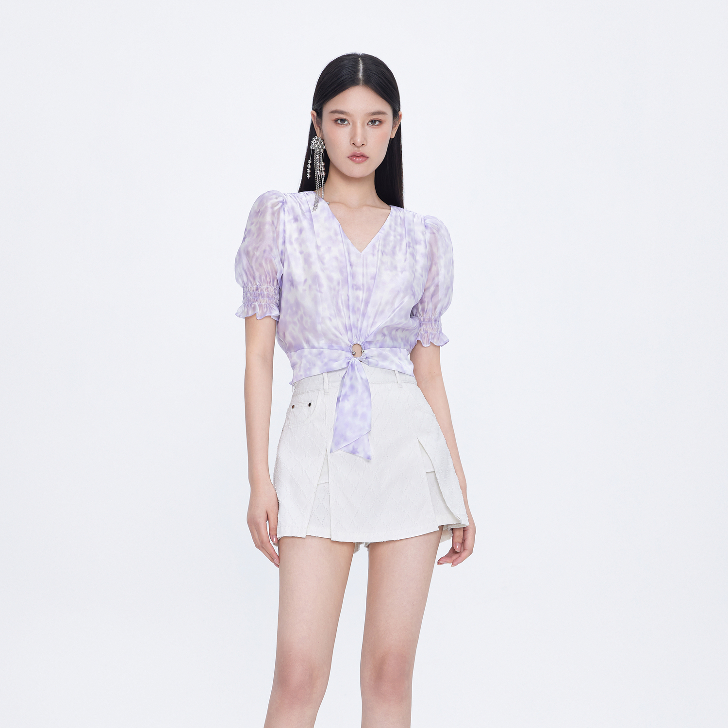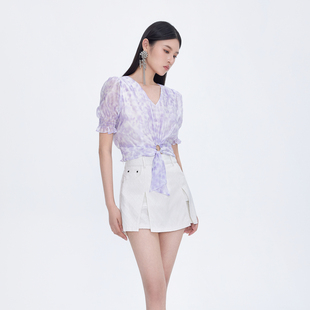 韓系清甜風V領系帶雪紡衫 上衣2025夏季 依妙EMU浪漫印花泡泡袖由