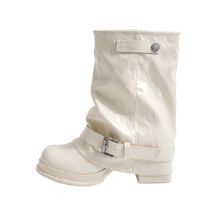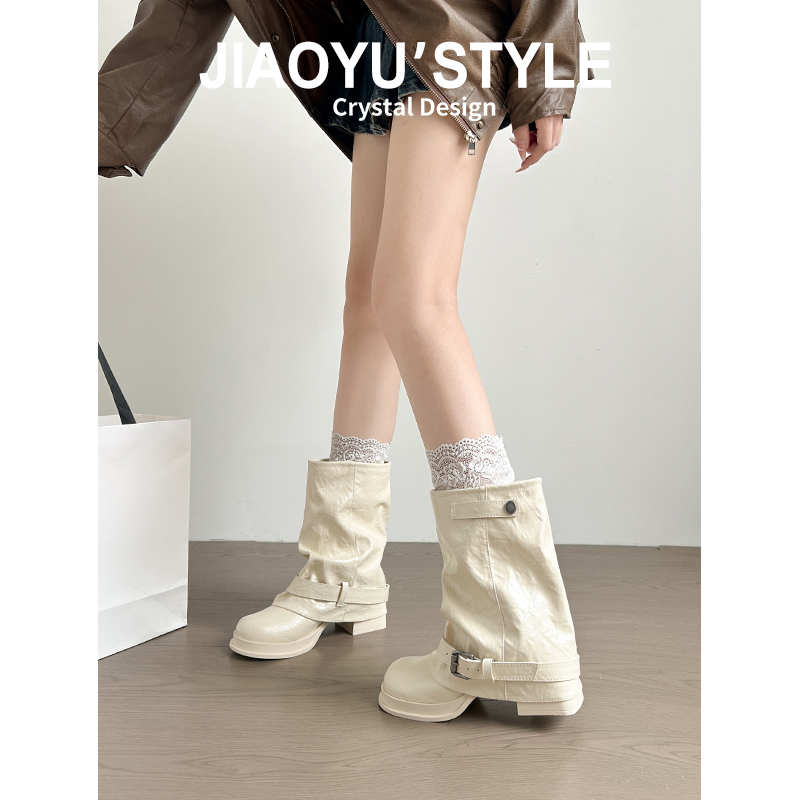 管靴2025新款 高跟褶皺堆堆靴溫柔甜美風騎士靴 驕嶼7cm中筒褲 真皮由