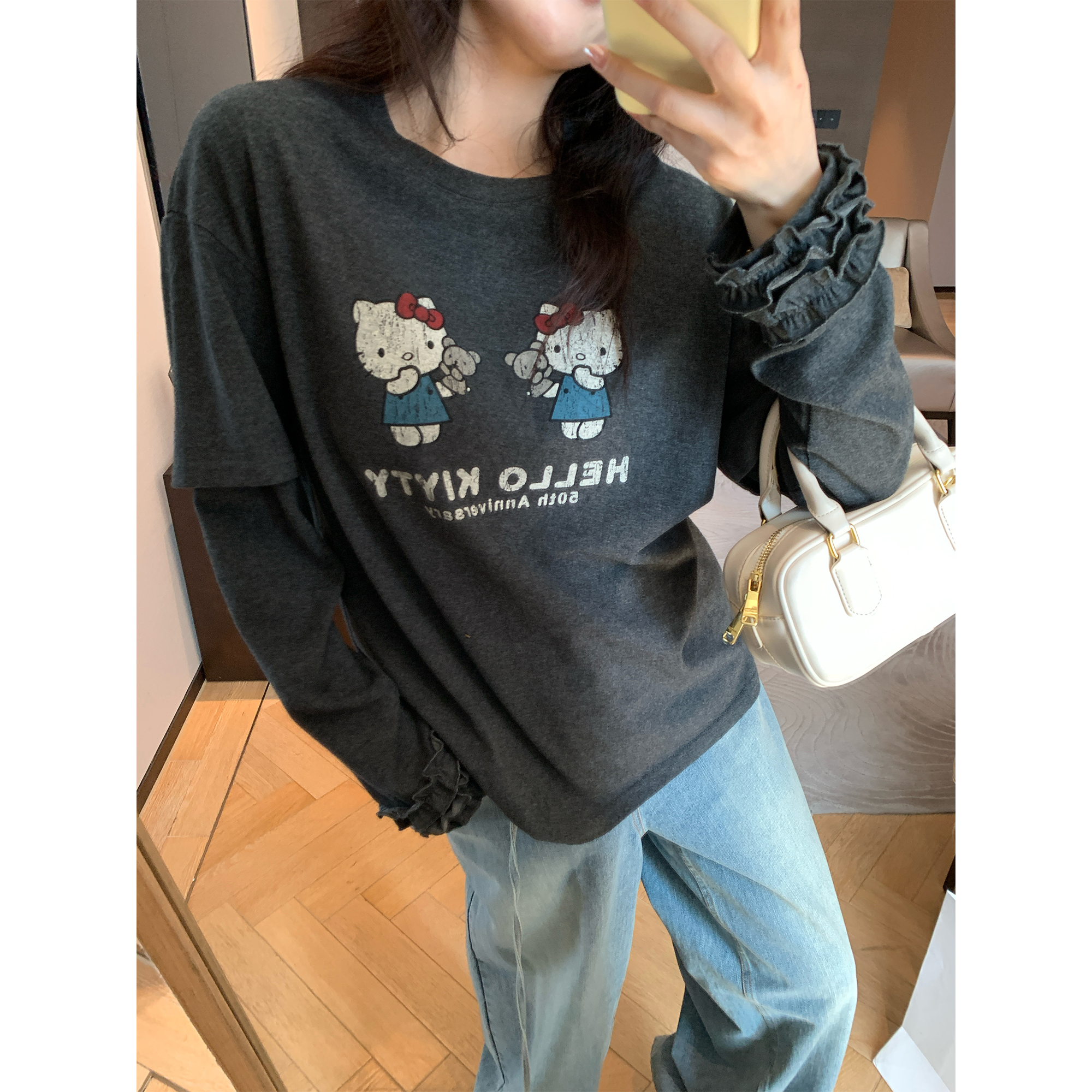 NAZ那子大碼 T恤胖mm氣質(zhì)上衣秋 設(shè)計(jì)感花邊Kitty貓印花假兩件長(zhǎng)袖由