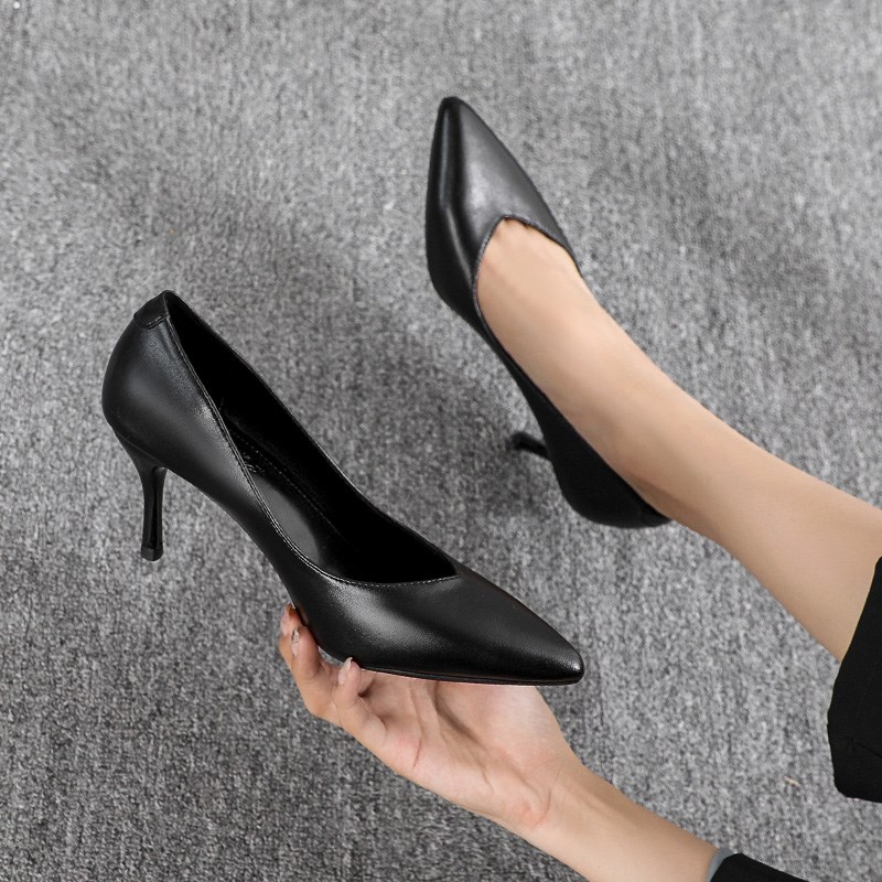 職業(yè)鞋 百搭尖頭禮儀軟皮通勤酒店上班細 女f黑色高跟鞋 極速工作鞋由