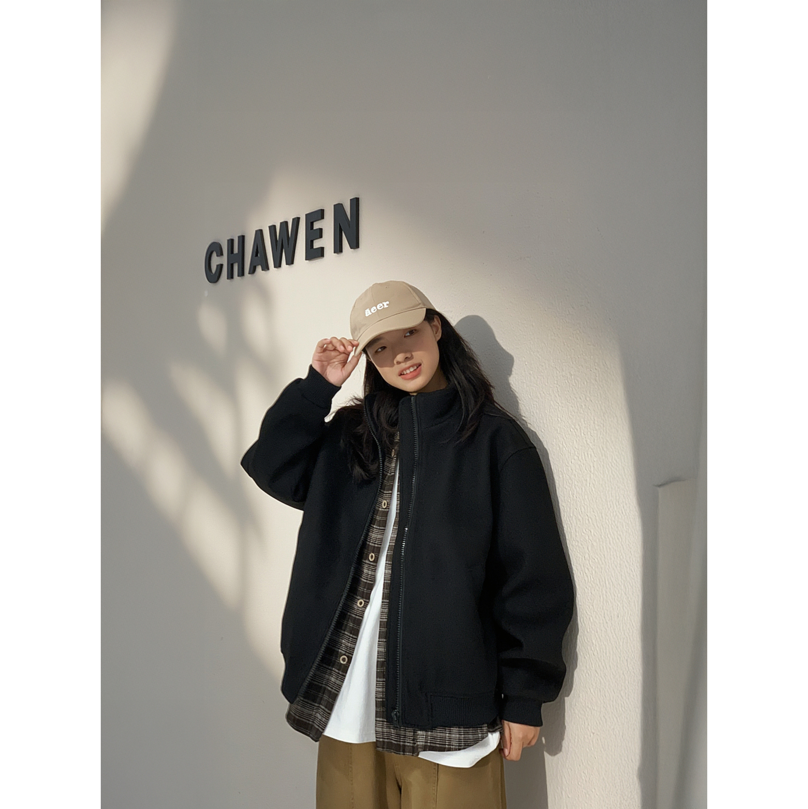 美式 日系立領百搭休閑寬松黑色毛呢短外套 復古呢夾克秋冬男女開衫由