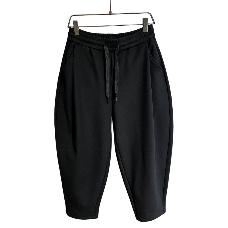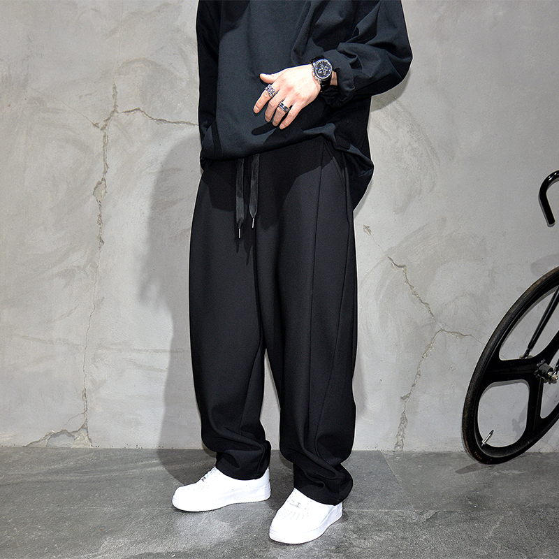 黑色垂墜感松緊腰闊腿直筒休閑西褲 子 男青年痞帥潮牌純色闊腿長(zhǎng)褲由