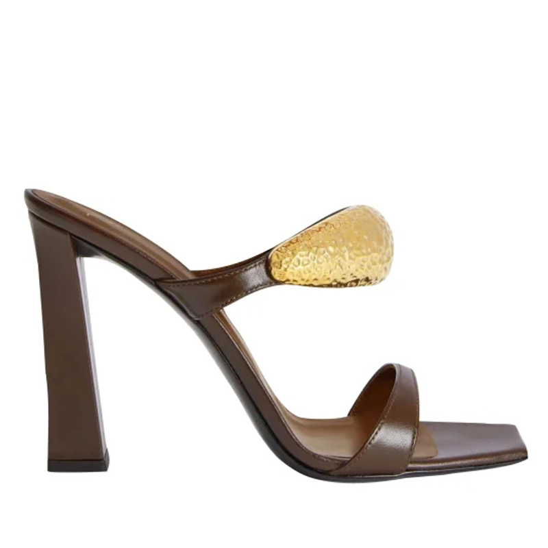 露趾粗跟外穿性感半拖女鞋 方頭金屬一字扣帶高跟涼鞋 2025早春新款由