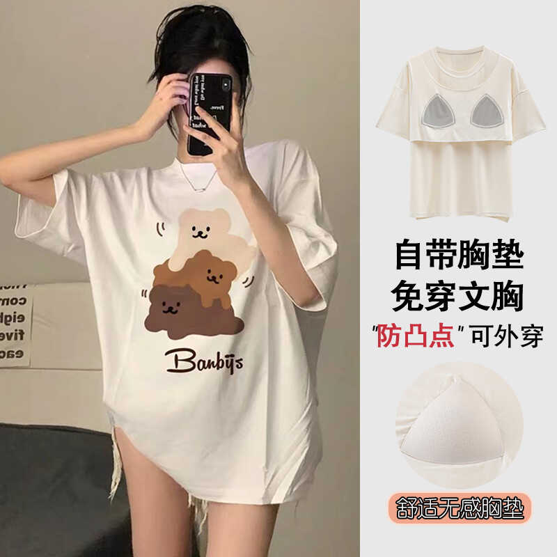 純棉睡衣女夏季 t恤單件上衣bra新款 外穿免文胸半袖 體恤 帶胸墊短袖由