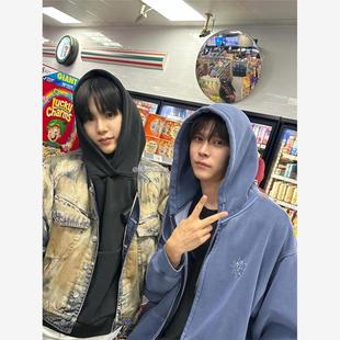復古藍色涂鴉拉鏈連帽衛衣女男學生情侶上衣外套 Riize宋銀碩同款由