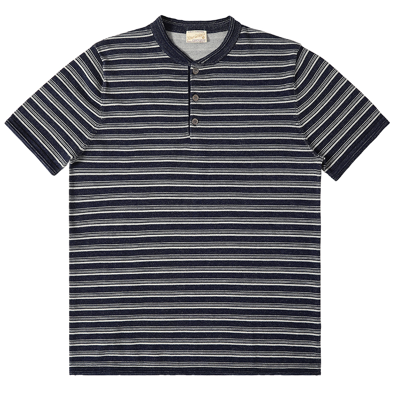 針織衫 MBBCAR窄幅 復古亨利領套頭短袖 海軍條紋藏藍花紗老布感美式由