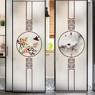 新中式 飾磨砂貼紙 圓形玻璃貼膜花鳥山水荷花圖案陽臺客廳門窗裝由