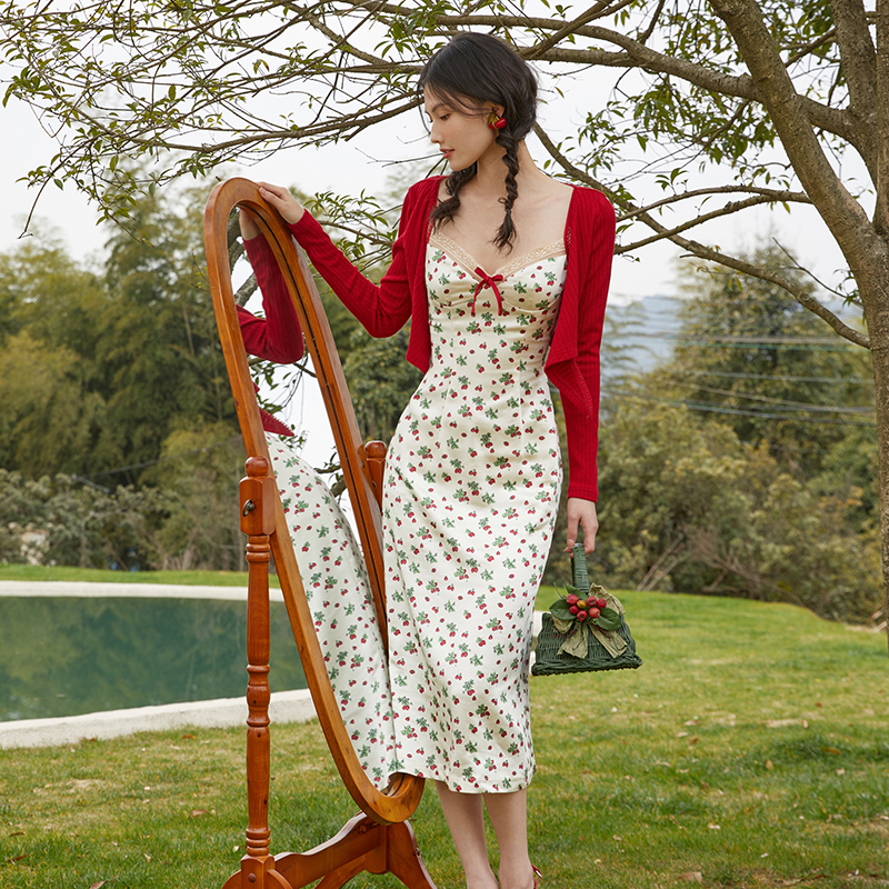 LaceMade 定制面料法式 復古鄉村緞面印花吊帶連衣裙開衫 草莓農場由