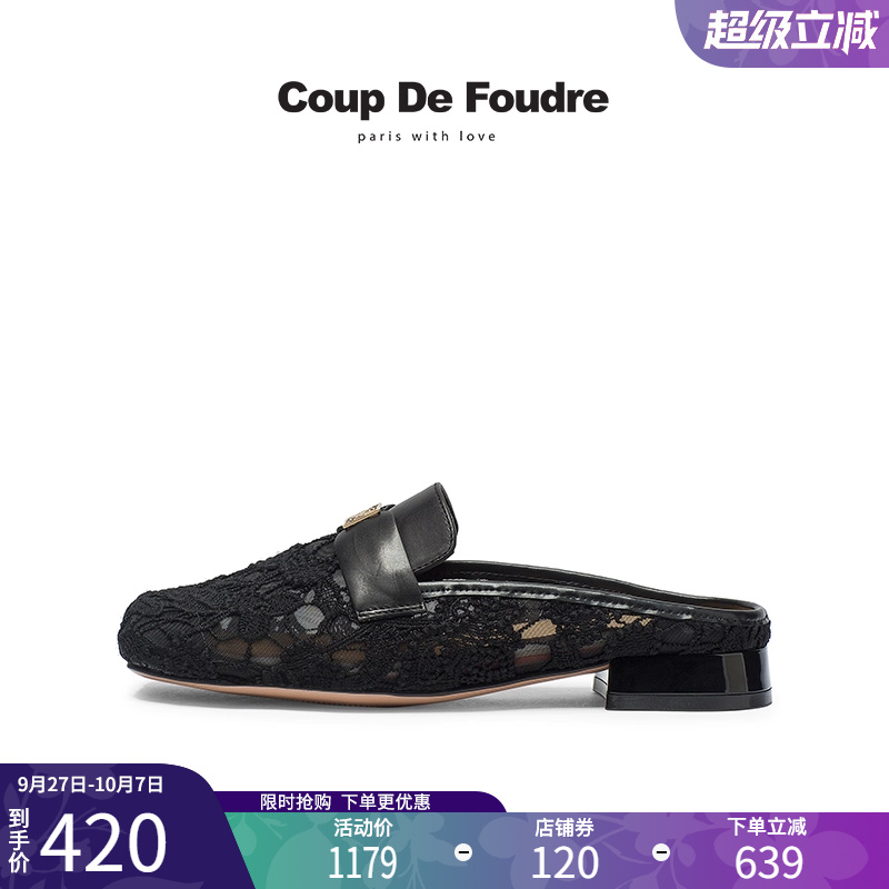 法式 CDF女鞋 2025夏季 新款 粗跟方頭蕾絲透氣網紗包頭半拖 穆勒拖鞋由