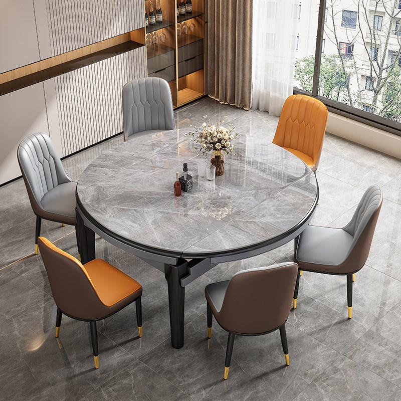 現(xiàn)代簡約巖板餐桌椅組合真皮椅伸縮實(shí)木折疊可變圓桌輕奢家用飯桌由