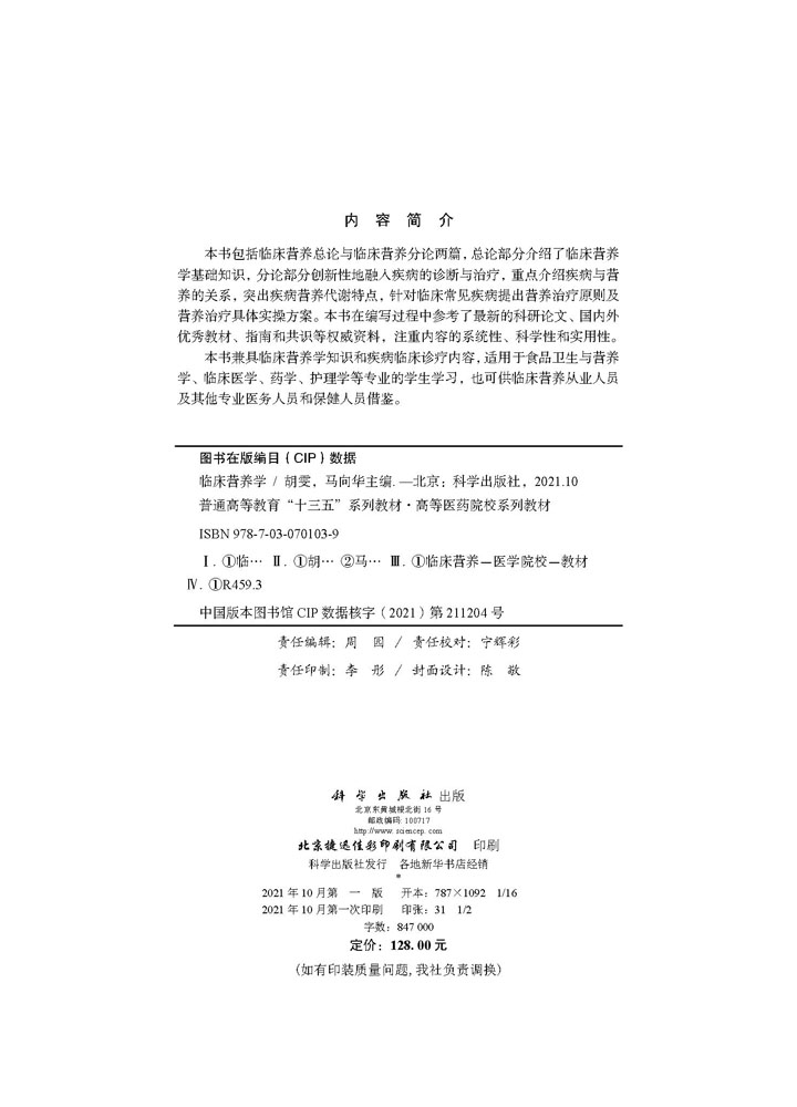 社 臨床營(yíng)養(yǎng)學(xué) 9787030701039 科學(xué)出版 馬向華 十三五系列教材高等醫(yī)學(xué)院校系列教材 主編胡雯由