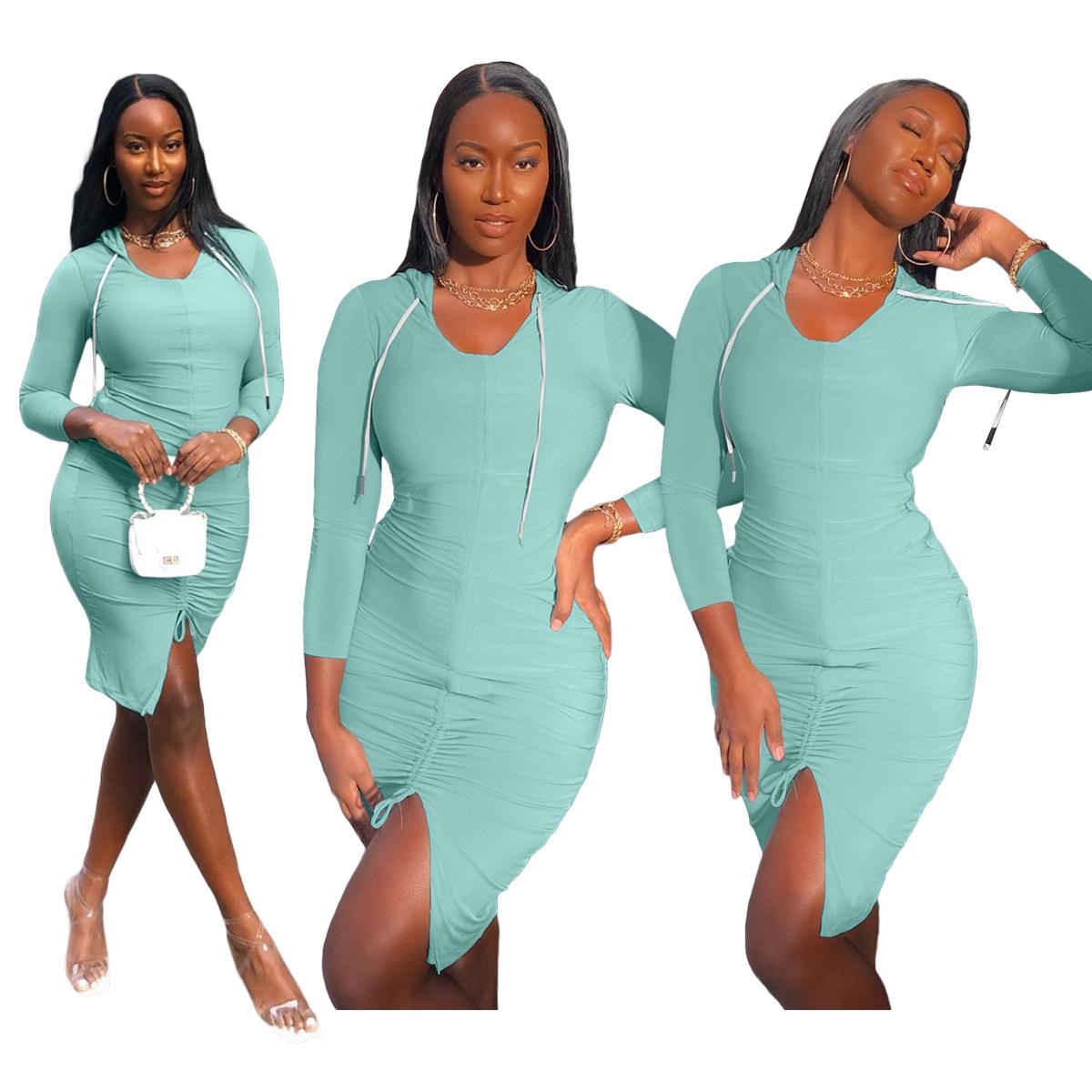 Dress Hooded Solid Sleeve Skirt Color Set Slit Shirred Midi由
