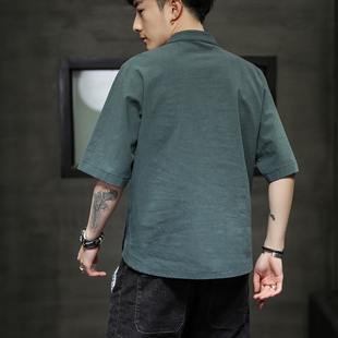 上衣中國風大碼 亞麻短袖 t恤男夏季 寬松立領復古男士 體恤 棉麻半袖由