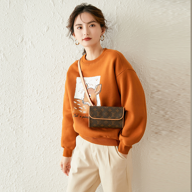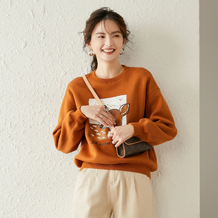 白鹿語小鹿印花休閑上衣2024冬季 衛衣女 加絨加厚圓領寬松落肩長袖由