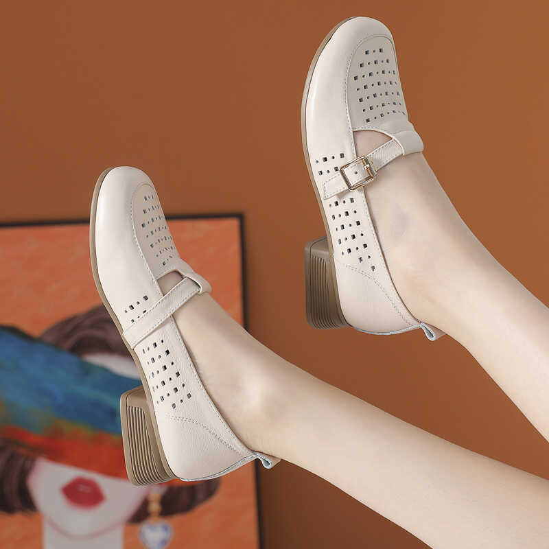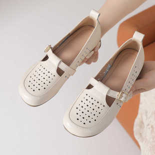 鏤空樂福皮鞋 真皮洞洞單鞋 女包頭涼鞋 夏季 舒適透氣中跟軟底媽媽鞋由