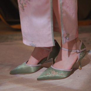 奈里復(fù)古民國風(fēng)綢緞刺繡優(yōu)雅旗袍尖頭中空一字帶40高跟鞋 細(xì)跟單鞋由