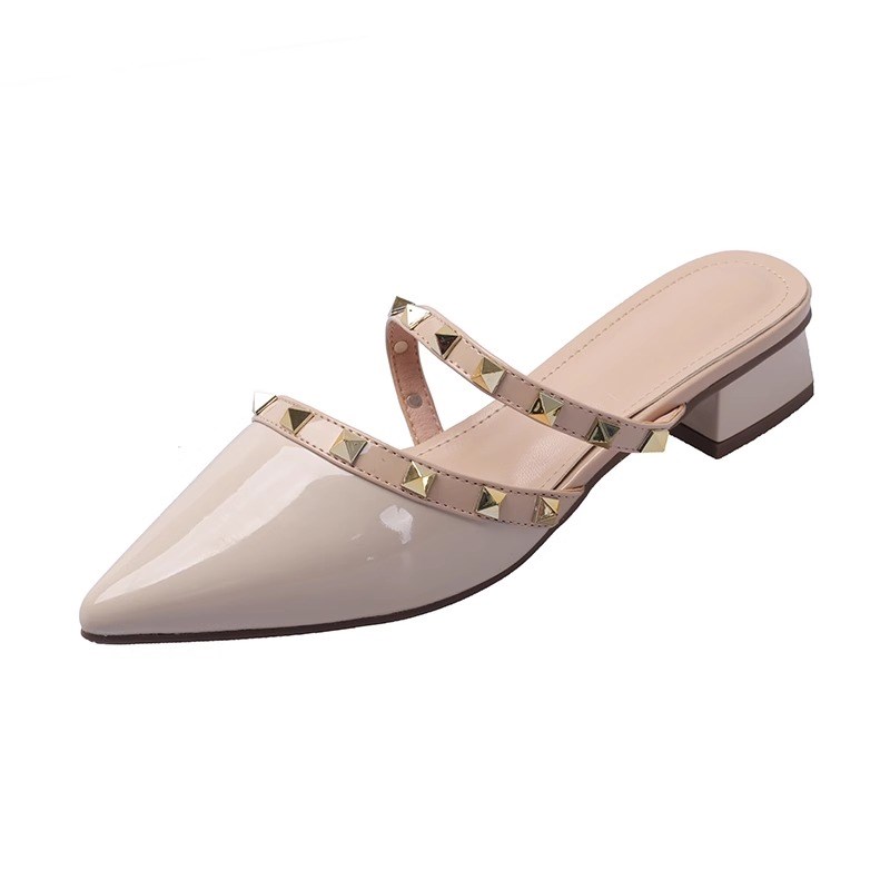 柳釘四季 沙灘中跟柳丁包頭涼拖 女夏外穿新款 尖頭漆皮鉚釘半i拖鞋由