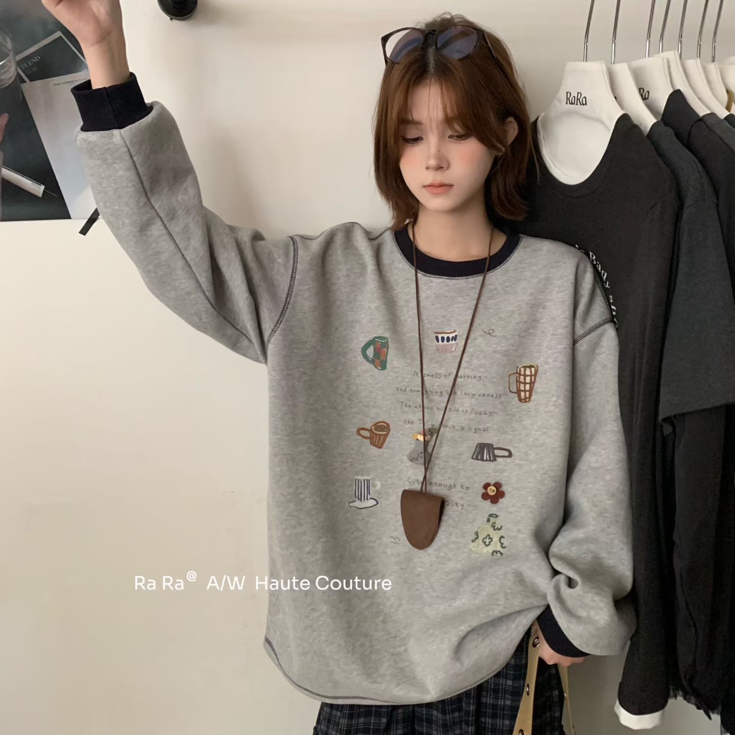 RaRa 衛(wèi)衣 Style韓系圓領(lǐng)撞色明線卡通圖案設(shè)計(jì)感套頭顯瘦百搭長(zhǎng)袖由