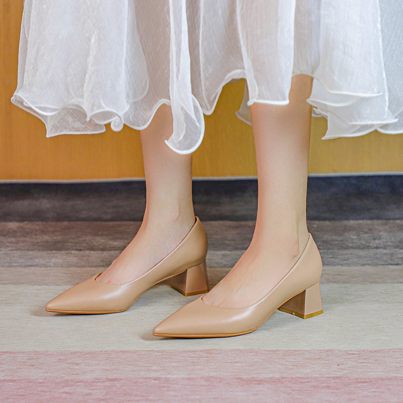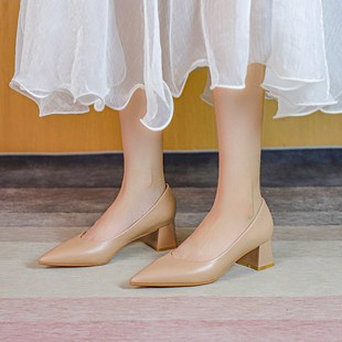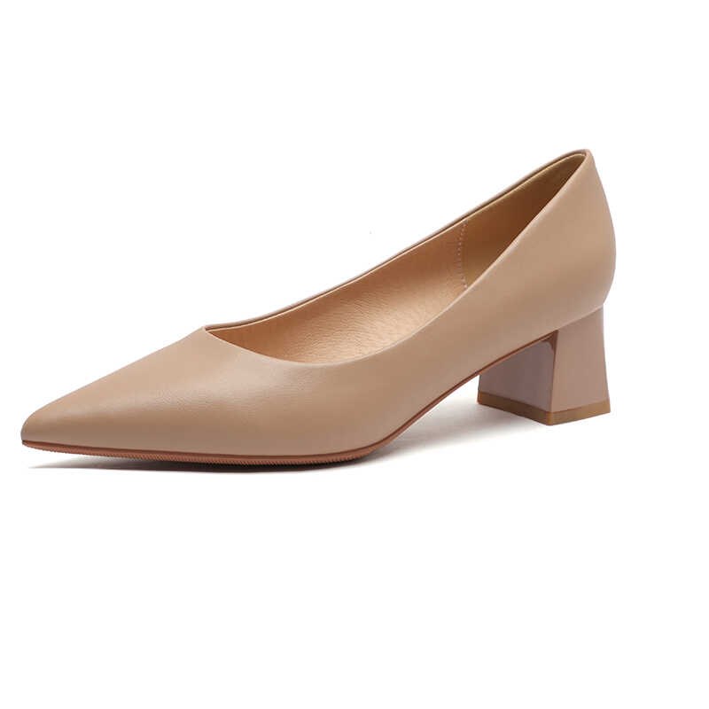 千百度裸色細(xì)高跟鞋 淺口氣質(zhì)通勤單鞋 女真皮不累腳 靜音系列