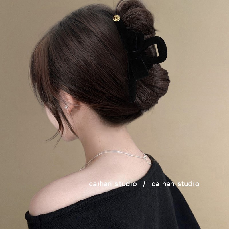 精致公主頭鯊魚夾女盤發 低調千金黑絲絨蝴蝶結女高級感2024新款由