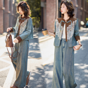 復古氣質闊腿褲 兩件套 女2025春秋新款 設計感蕾絲拼接盤扣牛仔套裝由